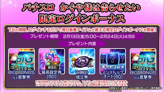 配信決定記念・期間限定ログインボーナスとして「パチスロ かぐや様は告らせたい」アプリで使用可能なアイテムをプレゼント。最大5日間のログインで「BIG BONUS以上直撃券」を含む全ての報酬を獲得できます。