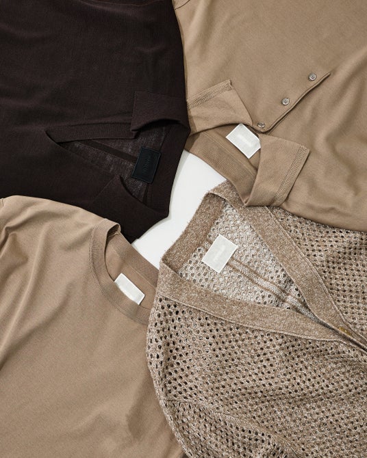 PIPPIOLINO (右上から時計周りに)ニットポロ ¥33,000(税込)・ニットカーディガン ¥48,400(税込)・ニットTシャツ ¥27,500(税込)・スキッパーニットポロ ¥48,400(税込)