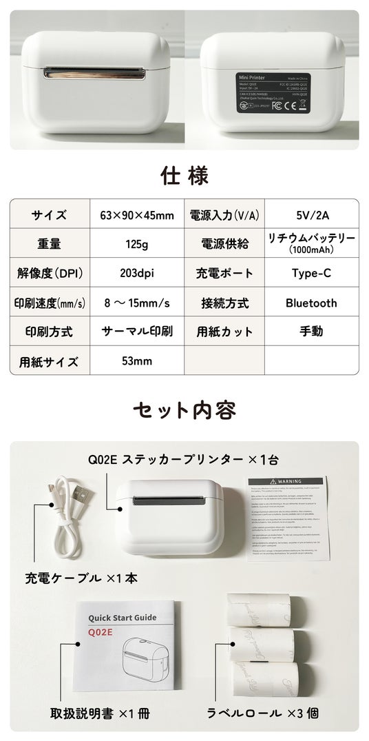 Q02Eは、スマホで撮った写真や作成したメモをその場で即座にプリントできる、手のひらサイズの感熱式プリンターです。重さはわずか125gと、一般的なスマートフォン(約177g)よりも軽く、バッグに入れてどこへでも持ち運ぶことができます 。