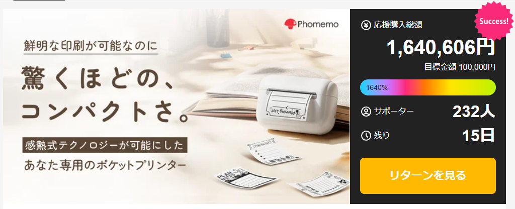 2月2日にスタートしたクラウドファンディングは、開始初日に目標金額を達成し、2月12日現在で1640%を超える164万円以上の支援を得ています。