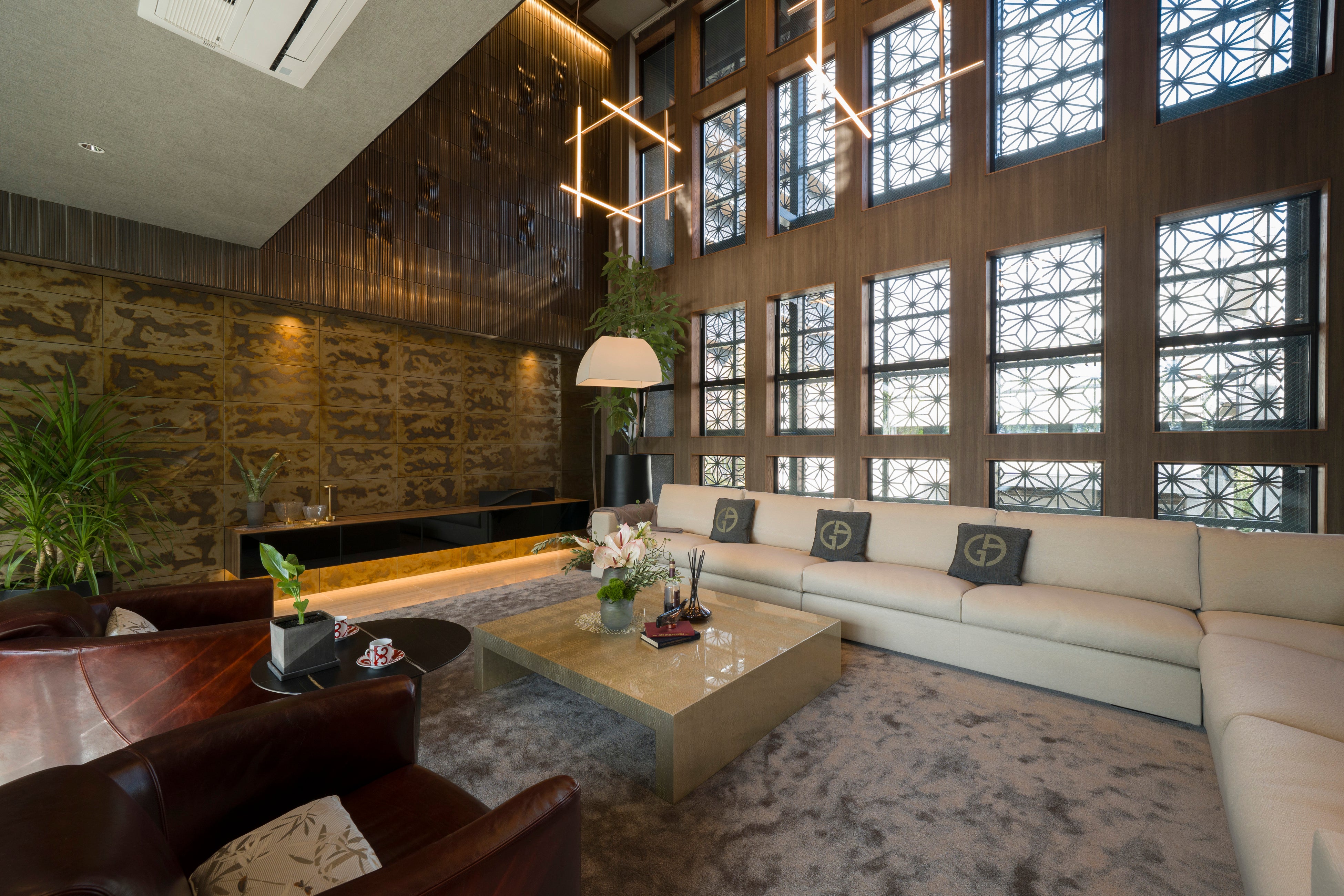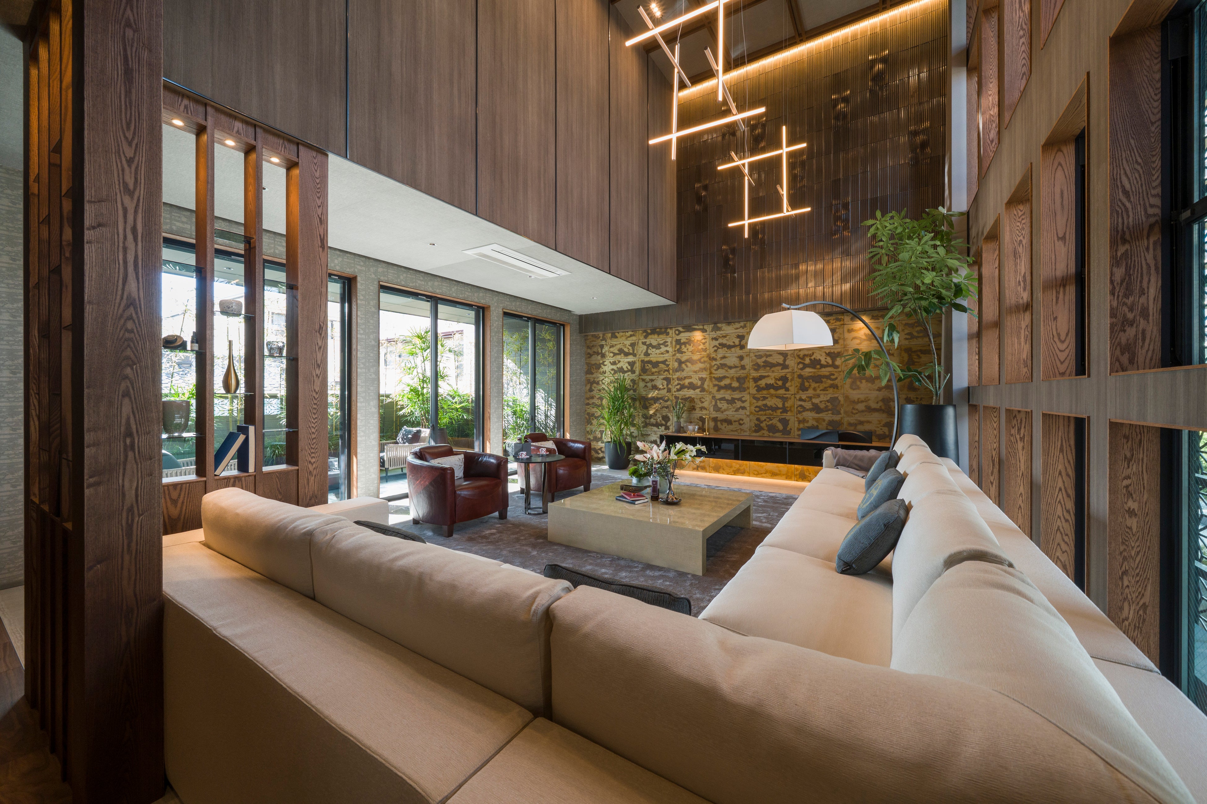 天井6mのリビング空間を彩る1枚1枚の「漆塗り」と美濃焼のタイル壁が静かに映える