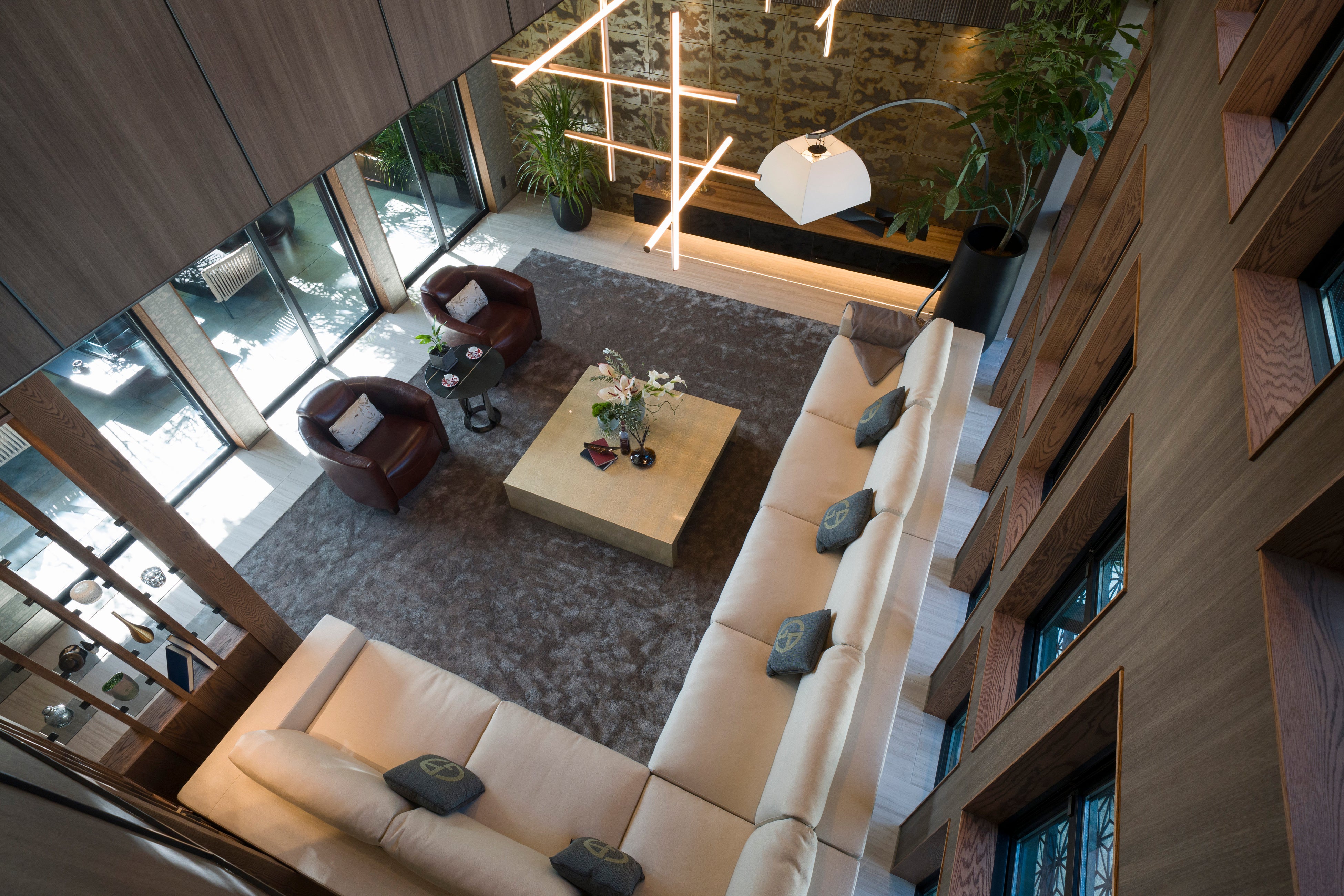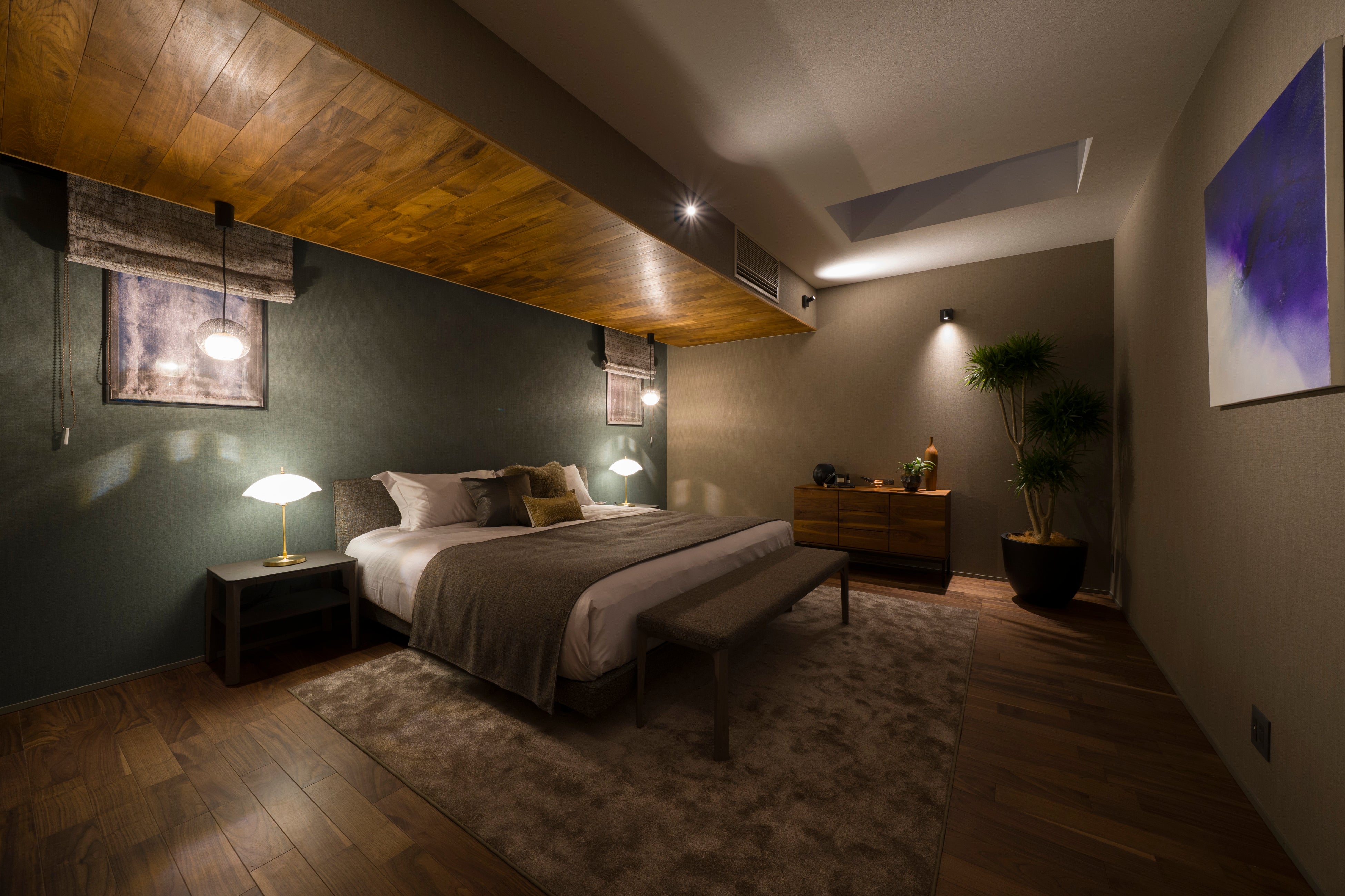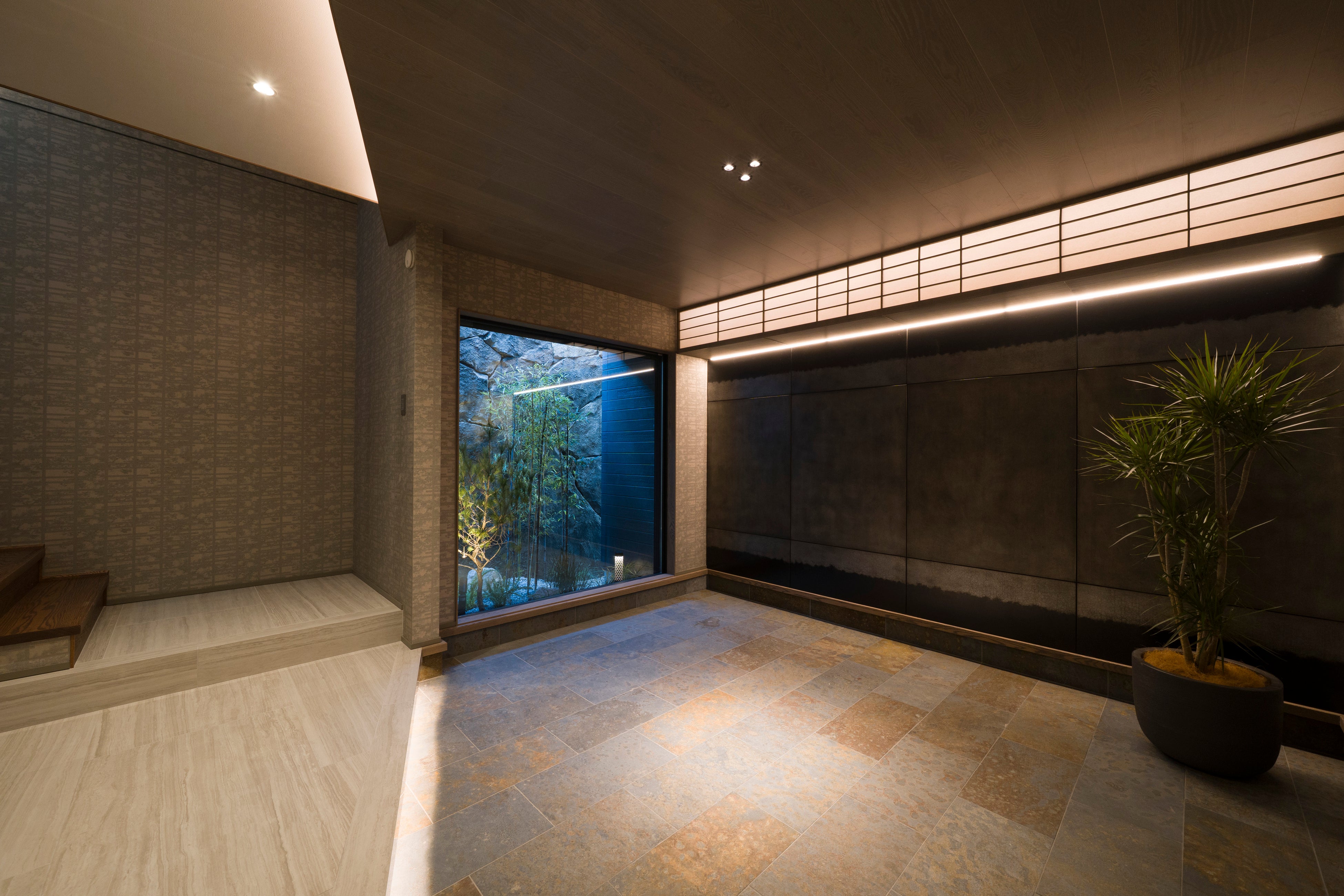 エントランスの坪庭やバルコニーには赤松や黒竹を組み合わせ、球形照明や間接照明によって昼夜で異なる表情を見せる構成としています。ルーフバルコニーには約20種の植物を配置し、邸宅全体に自然の気配を巡らせています。