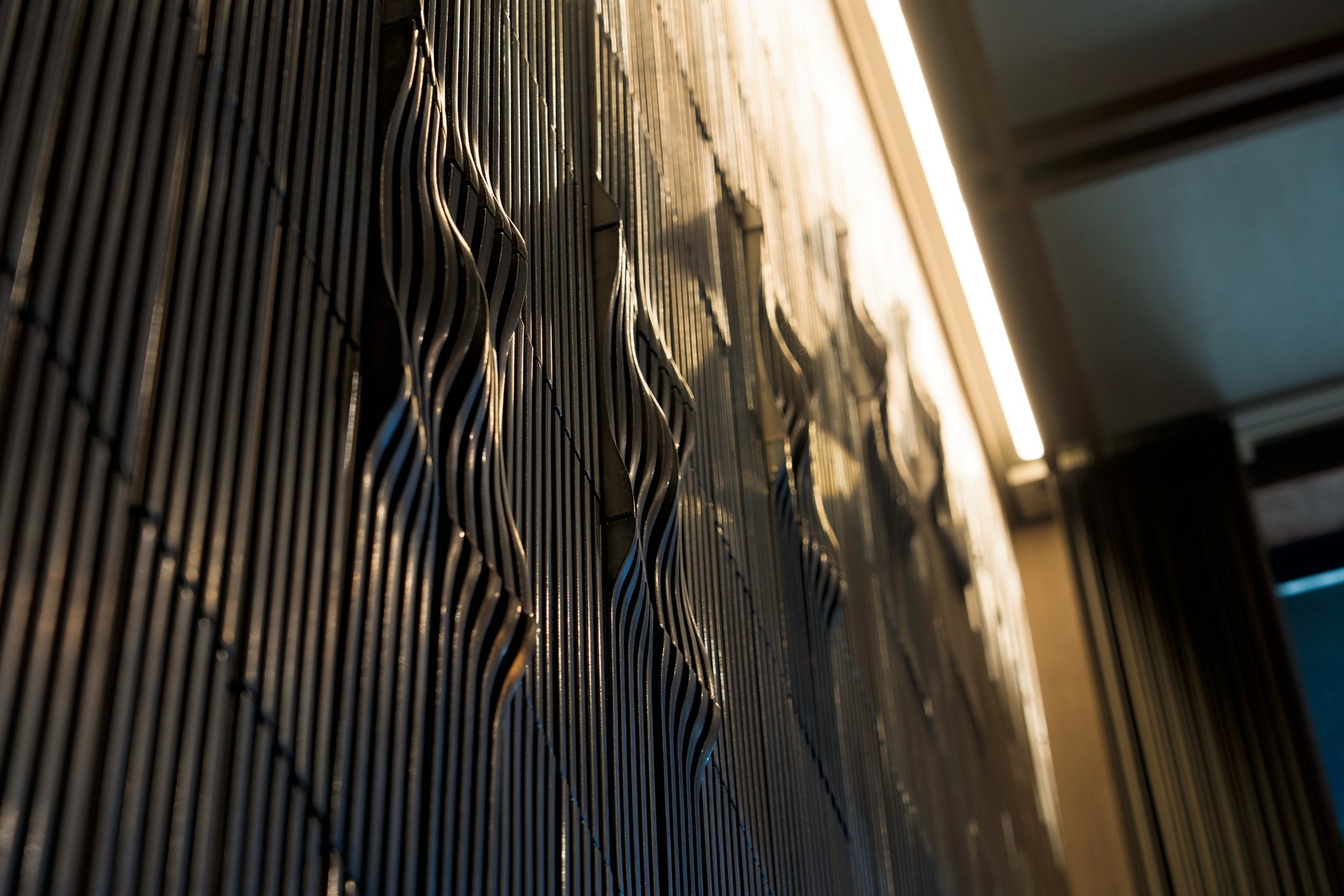 吹き抜け空間の壁面には、タイルアーティスト・山本庸志人氏によるオリジナルタイルを用いた造形が設えられています。タイルは押出成形によって製作され、格子状の構成の中に、削りによって生まれた波のような起伏が点在しています。