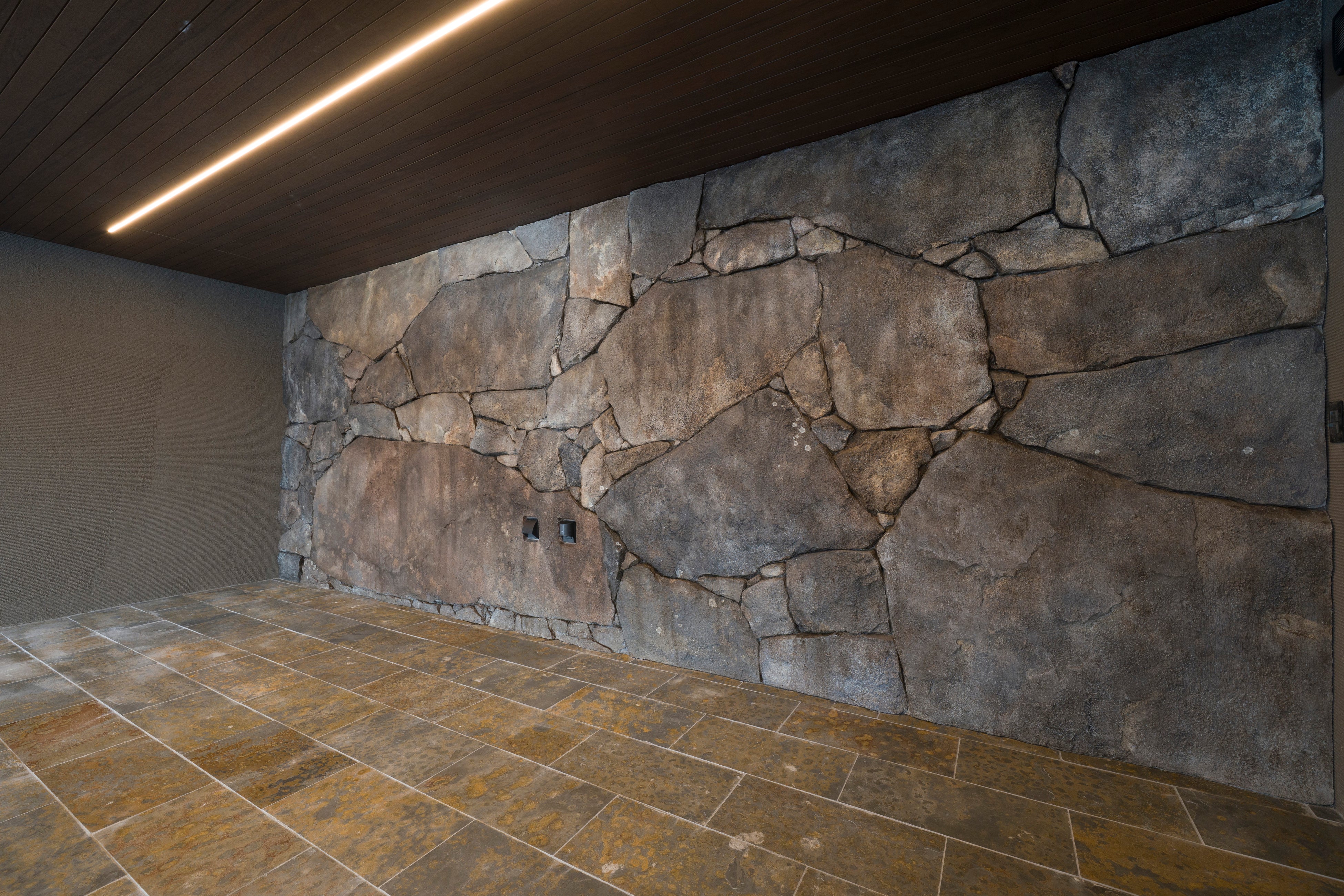 邸宅内の象徴的な要素の一つが、名古屋城の石垣で知られる「清正石」を想起させる岩塊状の造形です。本造形は、テーマパークなど大型施設において造形を手がけてきたモルタル造形師・前野悟志氏が担当しています。