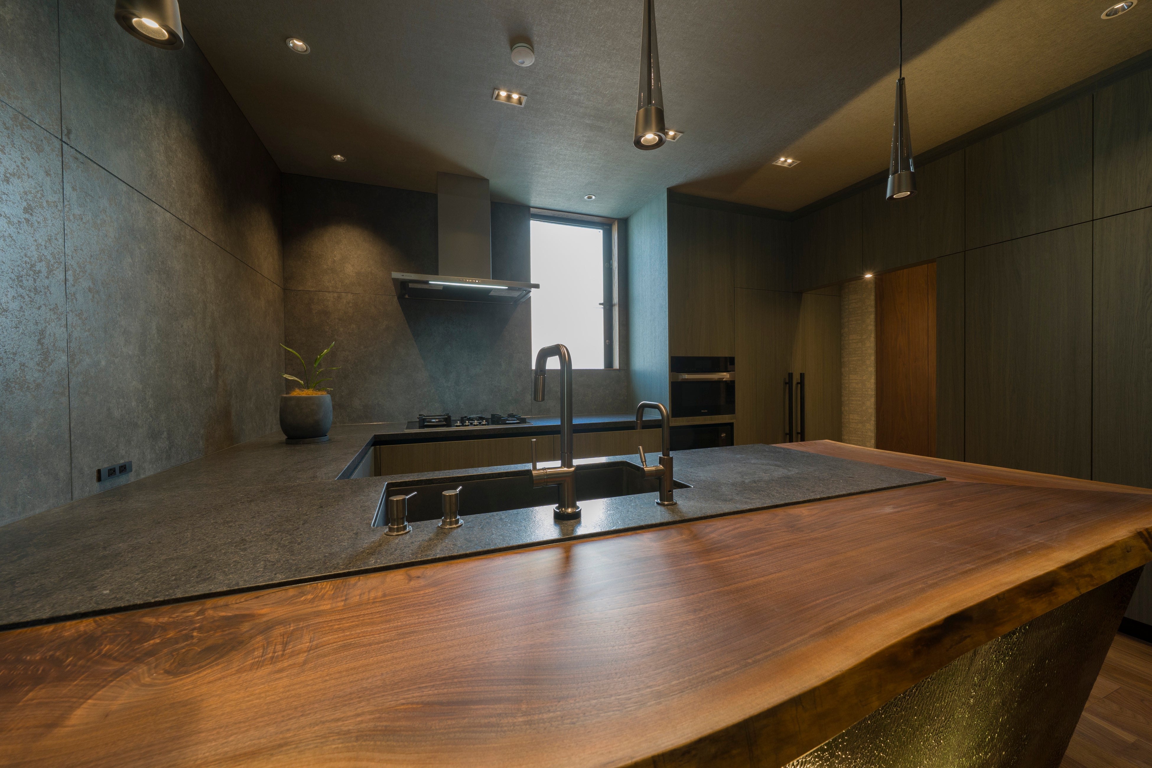 キッチンプランナー・長谷川大祐氏が手がけたキッチンは、レザー仕上げの御影石による天板を中心に構成されています。漆、石、木といった素材が用いられる住まい全体の中で、キッチン単体が過度に主張しないよう、造形を抑えた構成として計画されています。