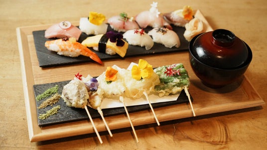 日本の伝統的な食、【天ぷら】とおちょぼ口の舞妓さんにも食べて頂けるようにと改良されて出来た【手まり寿司】を現代的に昇華したお料理を提供しております。