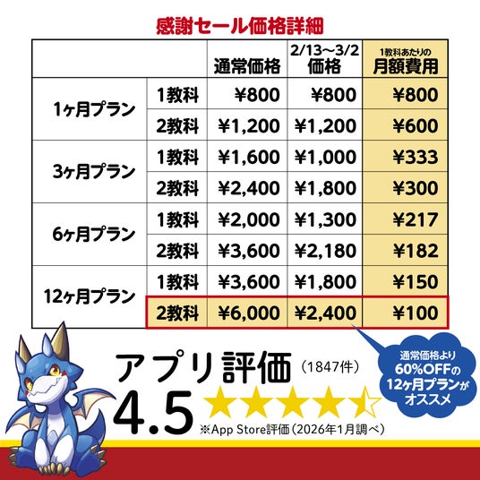 株式会社 学研ホールディングス(東京・品川/代表取締役社長:宮原博昭)のグループ会社、株式会社Gakken(東京・品川/代表取締役社長:南條達也)は、「学研ドラゴンドリル 算数/国語の学習アプリで学ぼう!」(iOS/Android版)のリリース3周年を記念して、2026年2月13日(金)~3月2日(月)の期間、サブスク料金(定額制利用料)が最大60%OFFになる感謝セールを実施いたします。