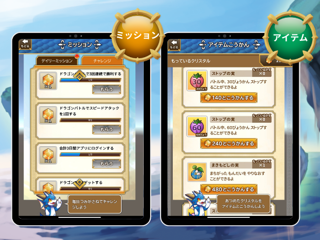 「問題に速く正解する(スピードアタック)」、「毎日ドラゴンバトルをする」などのミッションをクリアすると、バトルで使えるアイテムと交換できるクリスタルがもらえます。日々、コツコツと取り組むことで達成感が得られるため、「飽きっぽくても続けられる!」「無理なく学習習慣が身につく!」と好評です。