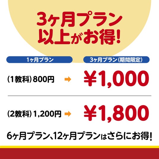 ▲セール期間中に12ヶ月プラン(2教科)を契約すると、なんと1教科1ヶ月あたり100円でプレイ可能!