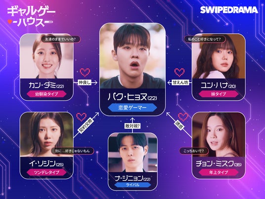 恋愛シミュレーションゲームの世界に入り込んでしまったゲーマーが、タイプの異なる4人のヒロイン――幼馴染タイプ/妹タイプ/ツンデレタイプ/お姉さんタイプ――から一斉に好意を向けられる、男性の夢を詰め込んだハーレム系ラブコメ。韓国で制作された本作は、韓国ドラマならではの映像美と、韓国人キャストのビジュアルの強さを最大に活かし、短尺でも没入感のある世界観を描きます。ハーレムラブコメ『ギャルゲーハウス』は、縦型ショートドラマアプリ「SWIPEDRAMA」にて独占配信いたします。