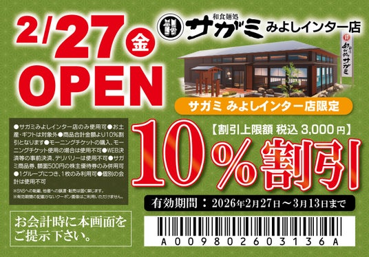 株式会社サガミホールディングスのグループ企業であるサガミレストランツ株式会社(本社:愛知県名古屋市守山区八剣二丁目118番地、代表取締役社長:鷲津 年春)は、2026年2月27日(金)に「和食麺処サガミみよしインター店」をグランドオープンいたします。
