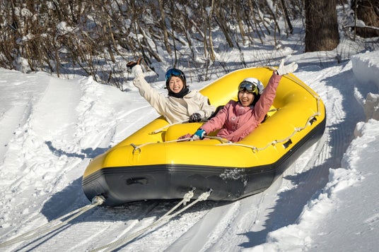 スノーモビルで引かれるスノーラフティング。ほかにバナナボート型もあり