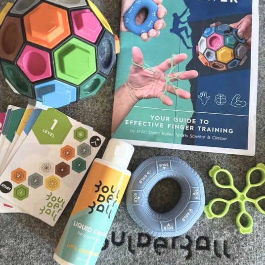 Boulderball POWERは、指を“強くする”ためだけでなく、“壊さずに育てる”ために設計されたフィンガートレーニングツール。スポーツサイエンティストDieter Kofler氏監修のガイドブック付き。