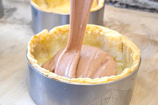 このパート・ブリゼは、1回目は生地だけを空焼きして香ばしさを引き出し、2回目はフィリングを流し込んでしっとりと仕上げる――二度焼きの工程で焼き上げています。