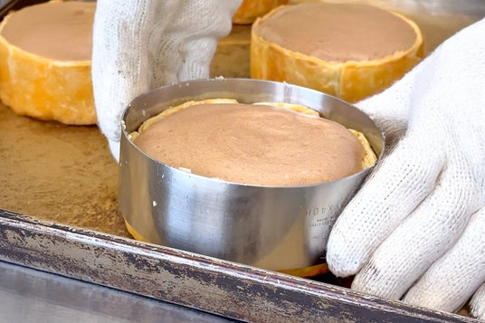 スフレのように湯煎でゆっくり焼く方法とは違い、このチーズタルトはガッと高温で短時間焼き上げるのがポイント。焼きすぎると生地に入った卵の影響で生地が固くなってしまうため、職人の経験と感覚が命を握る工程です。