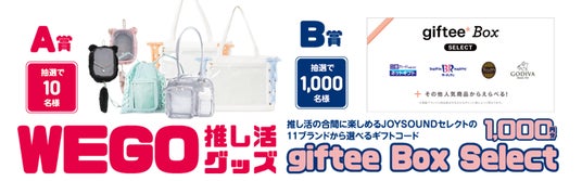 本キャンペーンへ参加するには、最新機種「JOYSOUND X1」をはじめとした対象機種を導入のカラオケ店舗で、スマートフォンをカラオケのリモコンとして利用できるアプリ「キョクナビJOYSOUND」(無料)を使って、「アニメカラオケ」「アニメ映像」の対象曲を選曲ください。その場でスマートフォンに表示されるスピードくじでWEGO推し活グッズを10名様にプレゼント!さらに、推し活の合間に楽しめるJOYSOUNDセレクトの11ブランドから選べるデジタルギフト 「giftee Box Select」 1,000 円分が総勢1,000名様に当たるチャンス!なお、スピードくじには、1曲につき1回、1日10曲分までチャレンジでき、キャンペーン期間中は何度でも、ご応募いただけます。
