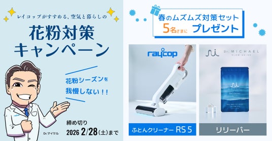 2026年の花粉は、昨年の猛暑と日照時間の長さが影響し、スギの雄花の成長が促されたことで例年を上回る「大量飛散」が予想されており、東日本~北日本では例年の1.3~2.5倍の飛散量になるとも言われております。今回、ふとんクリーナーなどアレルギーの予防を目的とした製品を展開するレイコップでは、これからの花粉シーズンの本格化に向けて、外からの花粉対策に活躍するおすすめの家電製品と、デリケートな時期のコンディションを優しくサポートするサプリメントをセットにしたraycop×Dr.MiCHAELの外と内からのダブルアプローチ【春のムズムズ対策セット】をご提案。
