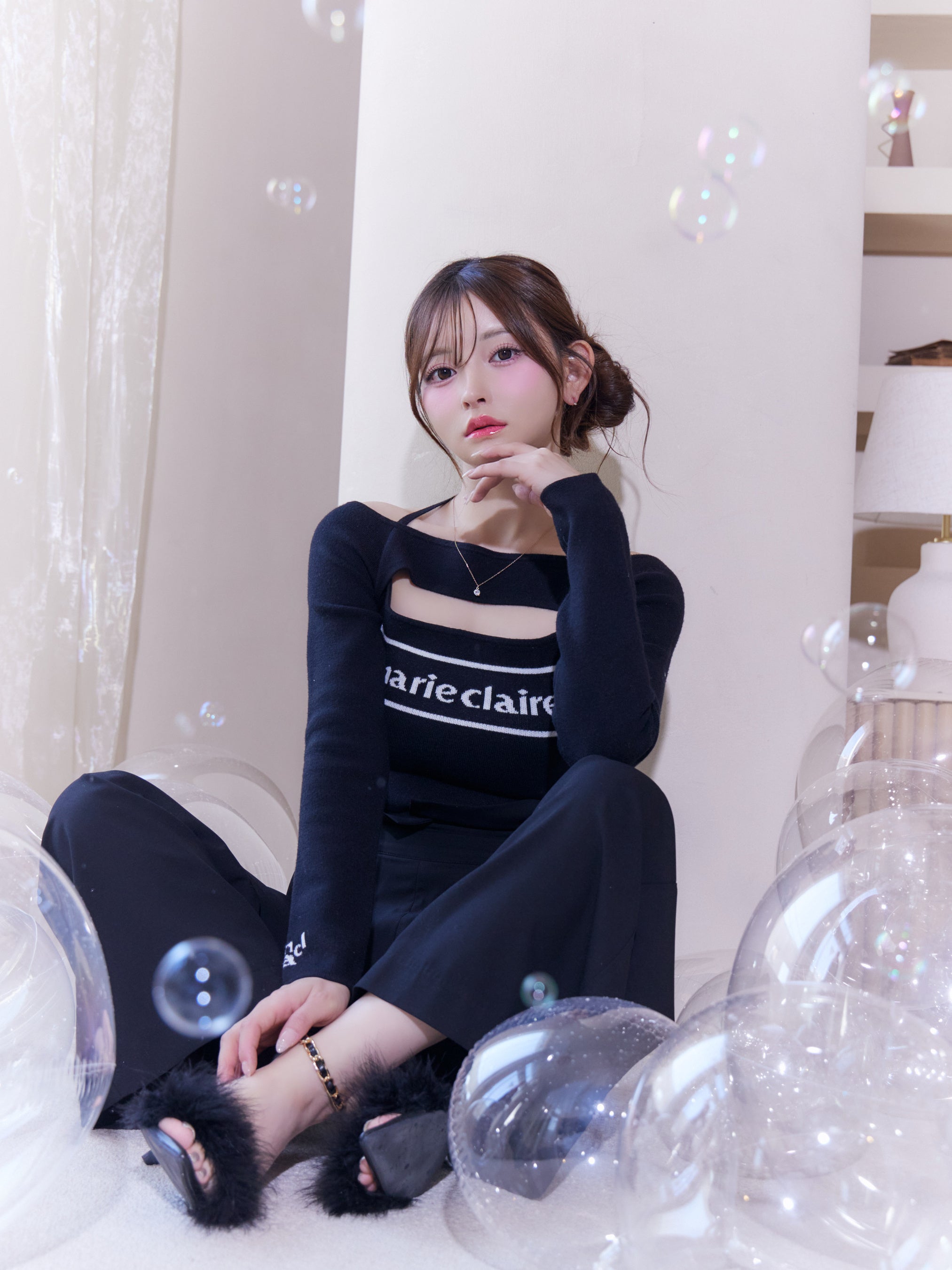 オフショルダーと華奢なストラップがデコルテを美しく演出し、コントラストの効いた「marie claire」ロゴが甘さを程よく引き締めます。