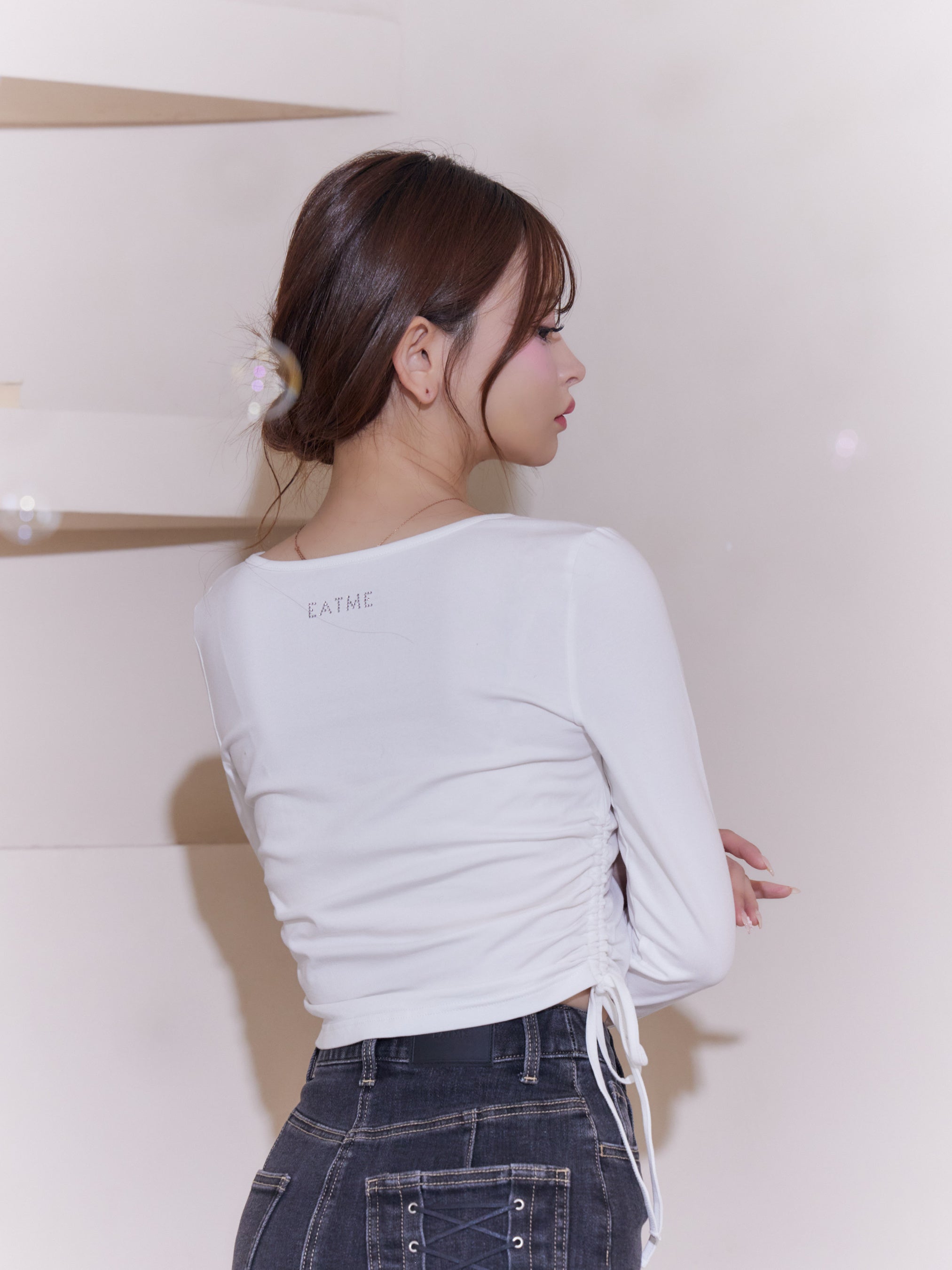 フロントのラインストーン「marie claire」ロゴとバックネックの「EATME」ロゴが、前後どちらから見ても洗練された印象を添える一着です。