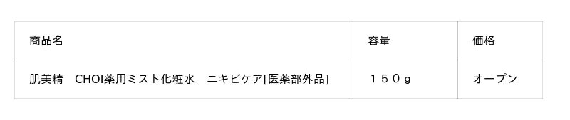 「肌美精 CHOI」シリーズから新たに展開する「肌美精 CHOI 薬用マイクロミスト化粧水 ニキビケア」[医薬部外品]は、逆さまにしても使えるスプレータイプの設計により、顔だけでなく背中などの死角になる箇所も、日常的にケアしやすいアイテムです。