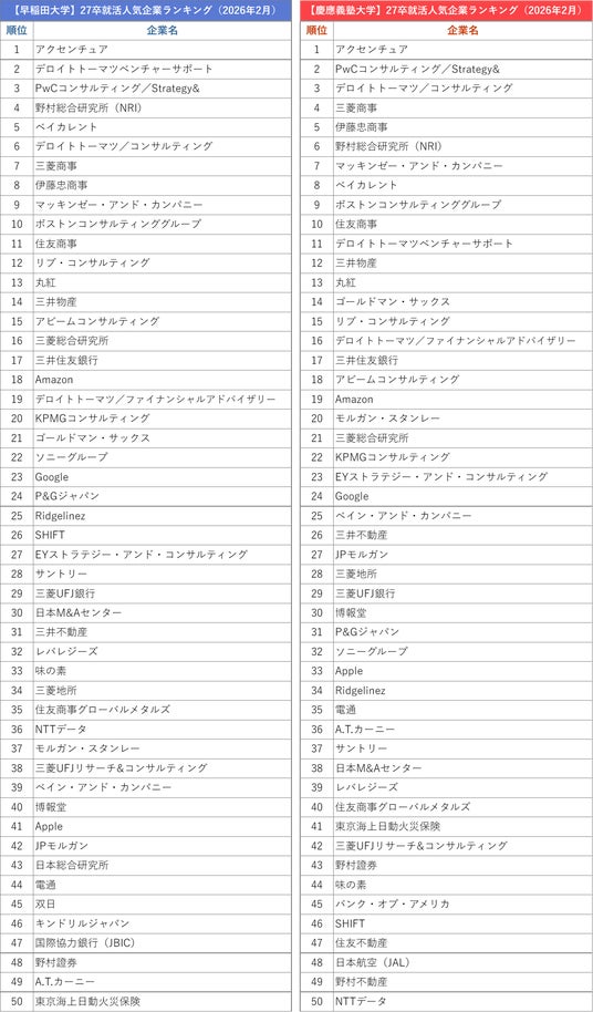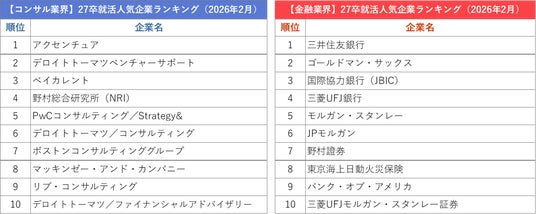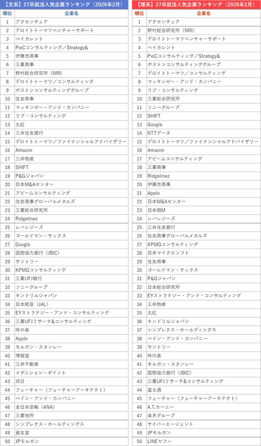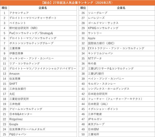 「世界で挑戦できる人材を育み、未来を創る」を掲げ、ユーザーファーストを追求したキャリアプラットフォーム「外資就活ドットコム」を運営する株式会社ハウテレビジョン(本社:東京都港区、代表取締役:音成洋介)の外資就活総合研究所は、「2027年卒 就活人気企業ランキング(2026年2月)」を調査し、総合ランキングのほか、文理別、大学別、業界別の各ランキングを発表します。本ランキングは調査時点における状況を示すもので、採用活動の時期によって学生の関心が移り変わるため、複数回に分けて調査を行っています。今回は全3回のうち、第3回(最終回)の調査結果です。総合ランキングの1~3位は前回(2025年10月)から変動はなく、早期から認知・関心を獲得してきた企業が引き続き上位を維持する結果になりました。
