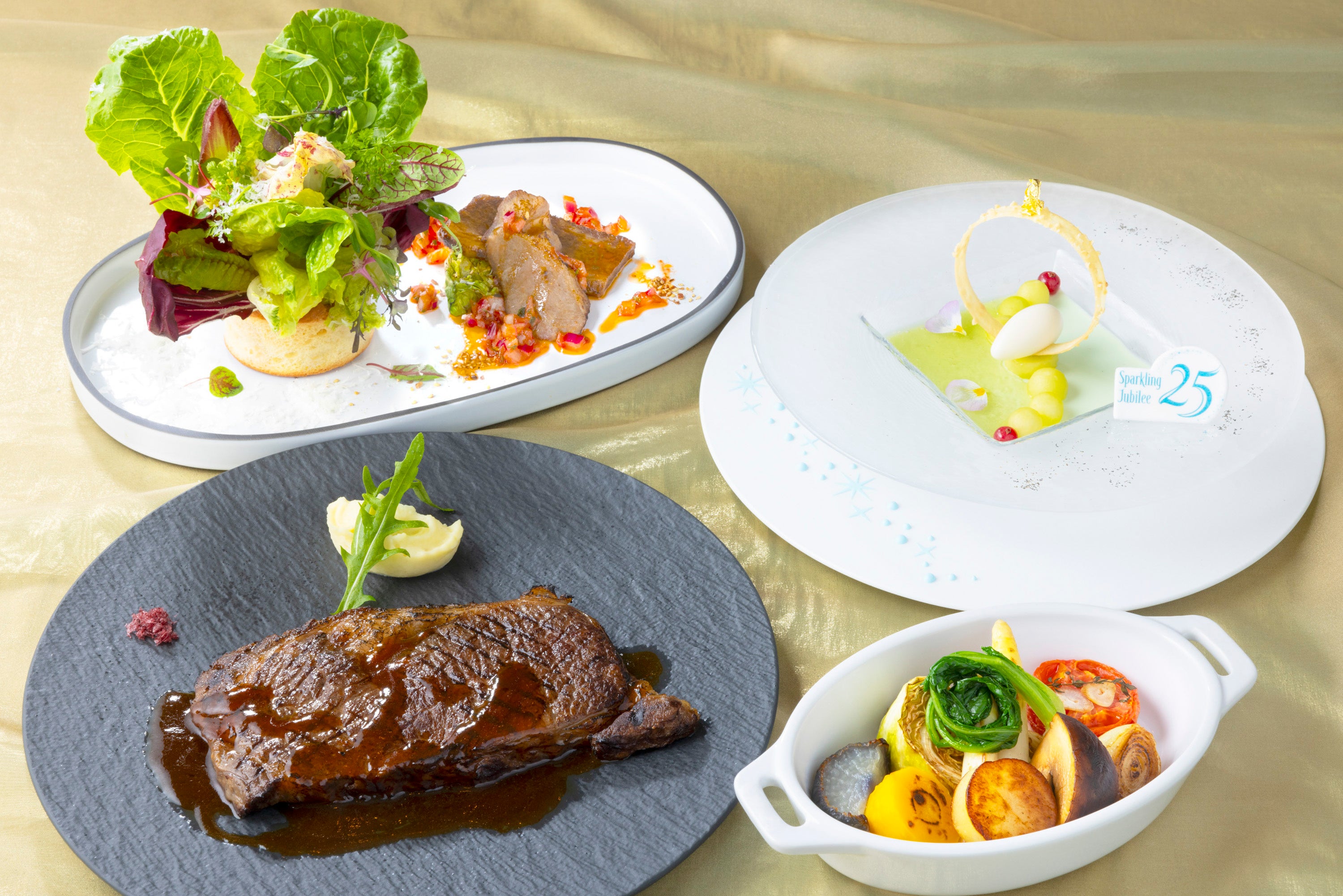 エンパイア・グリル(カリフォルニア料理)では、特別な25周年の装いのミニーマウスのモチーフを添えた爽やかなムースグラッセのデザートが祝祭のひとときを華やかに彩るスペシャルディナーをご用意します。また、エンパイア・グリル・シグネチャーディナーでは、国産牛サーロインをワイルドに焼き上げたエンパイア・グリルらしい豪快な一皿をご堪能いただけます。