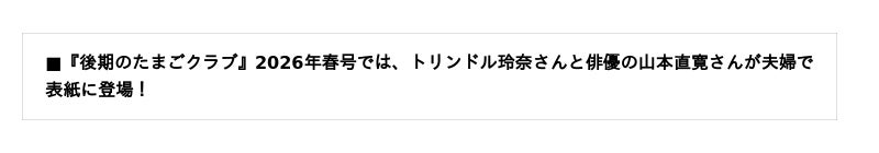 2026年2月14日発売の『後期のたまごクラブ』2026年春号では、トリンドル玲奈さんと俳優の山本直寛さんご夫婦が表紙を飾ります。トリンドル玲奈さんは、妊娠を発表された『中期のたまごクラブ』2026年冬号に続き、2号連続での表紙登場となります。