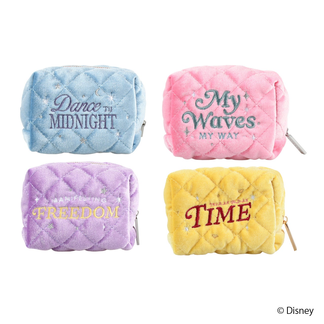 キルティング加工された上品な素材に各プリンセスをイメージしたスローガンを刺繍加工でデザインしたポーチ。
