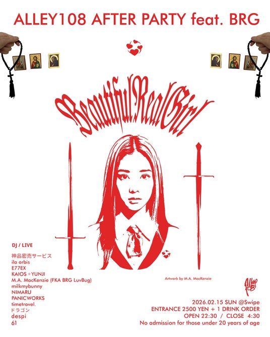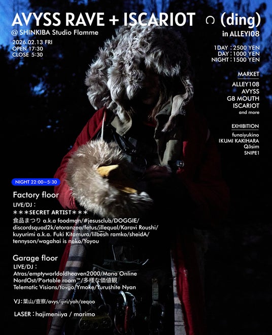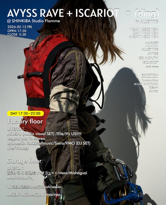 開催初日の夜は、舞台を廃倉庫へと移し、より集中的な音と身体の体験を発信するイベントを実施。AVYSSによるキュレーションと、ISCARIOT ᭦ (ding) によるキュレーション、そして<ALLEY108>の文脈に共鳴するアーティストたちが交差し、DJ、LIVE、VJ、インスタレーション、SHOPが一体となった夜を構成します。本イベントは、音楽的なエネルギーをひとつの場に凝縮し、<ALLEY108>という物語のスタートを飾る起動点として位置付けています。