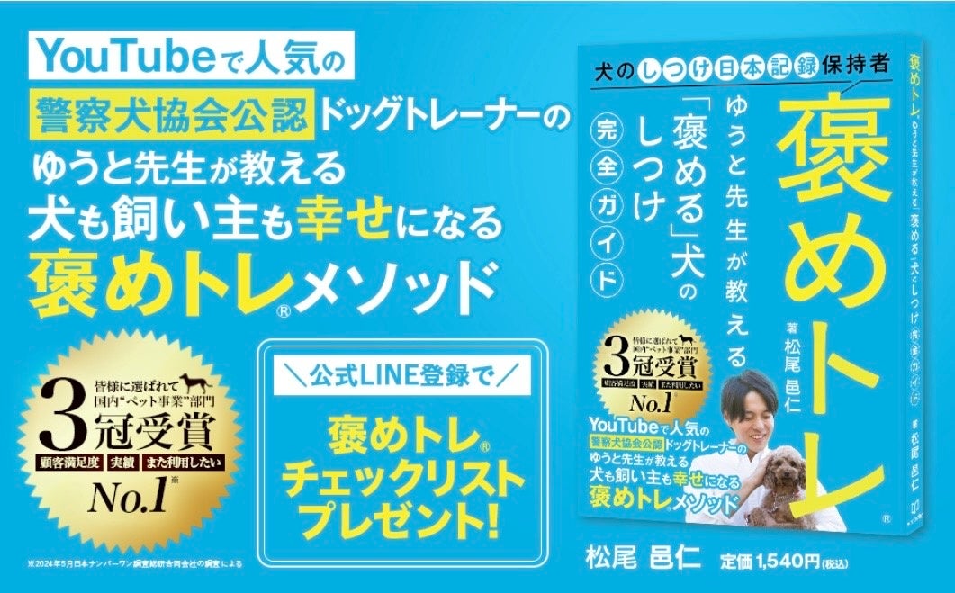 犬のしつけ教室「東京DOGS」(本社:埼玉県越谷市/代表:松尾邑仁)は、当社代表であり警察犬協会公認訓練士/ドッグトレーナーの松尾邑仁(マツオ ユウト)が執筆した初の著書『褒めトレ(R) ゆうと先生が教える「褒める」犬のしつけ完全ガイド』(単行本)が、2026年2月10日(火)に全国の書店およびオンライン書店にて発売されたことをお知らせいたします。