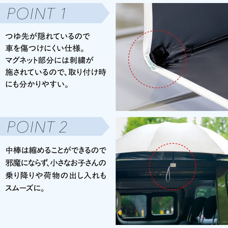 つゆ先2箇所にマグネットを内蔵。車の屋根に傘をピタッと固定できるため、両手が空き、雨の日の荷物の出し入れや、お子様の乗り降りがスムーズに。傘をたたむと表面が内側に入る構造なので、濡れた傘でも車内に水滴が落ちにくいのがポイントです。