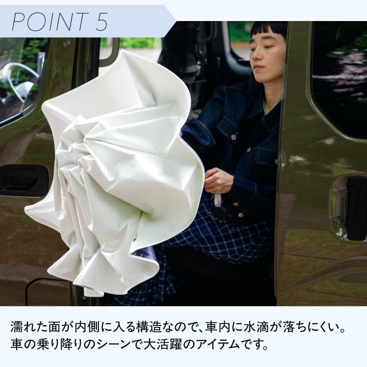 もうひとつは、傘のつゆ先に付いたマグネットが車の屋根にピタッと固定することで傘が自立する『遮光マグフィットミニ』。ヒンジドア・スライドドアのどちらにも対応しており、雨の日の乗り降りや荷物の出し入れの際のストレスを軽減。車移動が多い方や、お子様連れのファミリーなど、使う方のことを考えて作った傘です。車専用ではないため、通常の折りたたみ傘としても使えます。