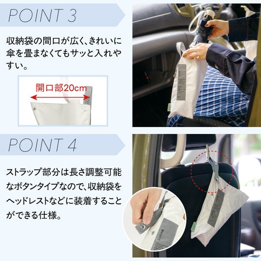 また、ボタンタイプのストラップが付いた収納袋は車のヘッドレストなどに装着可能。車内に1本置いておくだけで、急な雨も、照りつける日差しも安心です。
