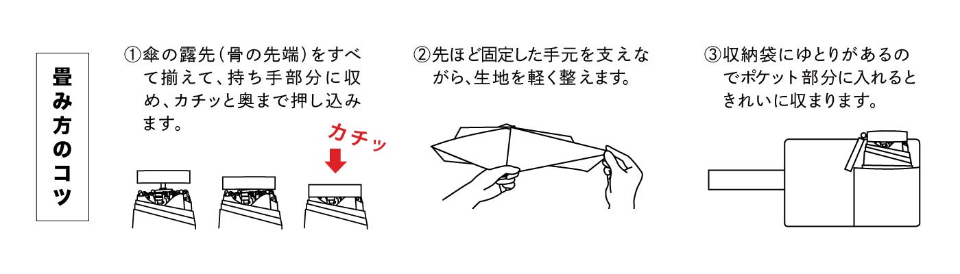 また、傘本体をきっちりたたまなくても、ゆるく巻いて収納できるロールタイプの収納袋は出し入れがしやすく、使いやすさも抜群。コンパクトだからこそ、デイリーユースに最適です。