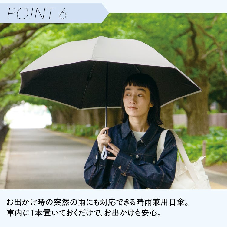 収納時のサイズは約11.5cmという持ち運びしやすいコンパクト設計に加え、UVカット率100%・遮光率100%・UPF50+*・はっ水加工などが施された生地を使用。機能性を徹底的に追求した、”小さくて頼れる”1本です。