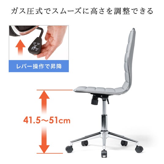 ロッキング機能は座面下のレバーでON/OFFの切り替えが可能。さらに硬さ調整ノブにより、体格や好みに合わせたセッティングが行えます。座面の高さもガス圧リフト方式で簡単に調節でき、デスクや身長に合わせた最適なポジションを素早く実現します。