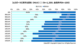 サイバーエージェントの連結子会社でeスポーツ大会「RAGE」を開催するCyberZは9月13日、今月実施した「eスポーツ」認知度調査の結果を発表した。インターネットを使ったアンケート調査で、前年比約2倍となる49.8%がeスポーツを認知しているという結果になった。調査対象は、日本に在住する16~69歳の男女1200人だった。