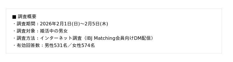 国内最多*¹の成婚数を誇る株式会社IBJ(代表取締役社長:石坂 茂、本社:東京都新宿区、東証プライム:6071、以下「IBJ」)が運営する婚活パーティーサービス「IBJ Matching」は、婚活男女1,105人を対象に「バレンタインに関する意識調査」を実施。本調査では、交際前の相手に対し、気持ちを伝えすぎない“挨拶代わりのチョコ”を「ご縁チョコ」と定義。その受け止められ方や、バレンタインが出会いの進展に与える影響について調査しました。