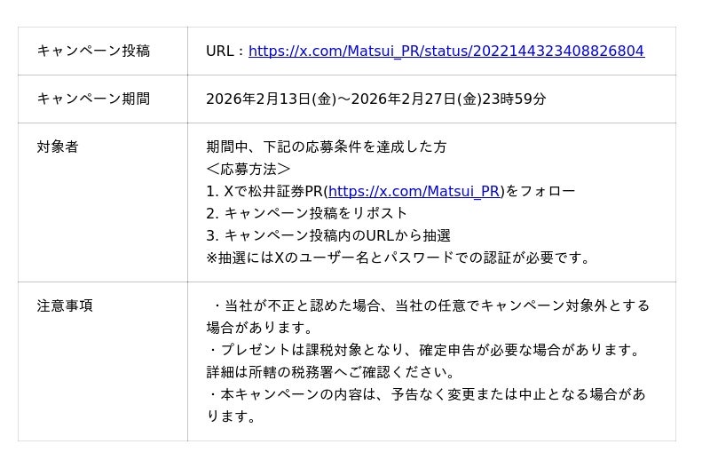 松井証券株式会社(本社:東京都千代田区、代表取締役 社長執行役員:和里田 聰、以下「当社」)は、2月13日(金)の「NISAの日」に合わせ、「NISAの日キャンペーン」を開催いたします。