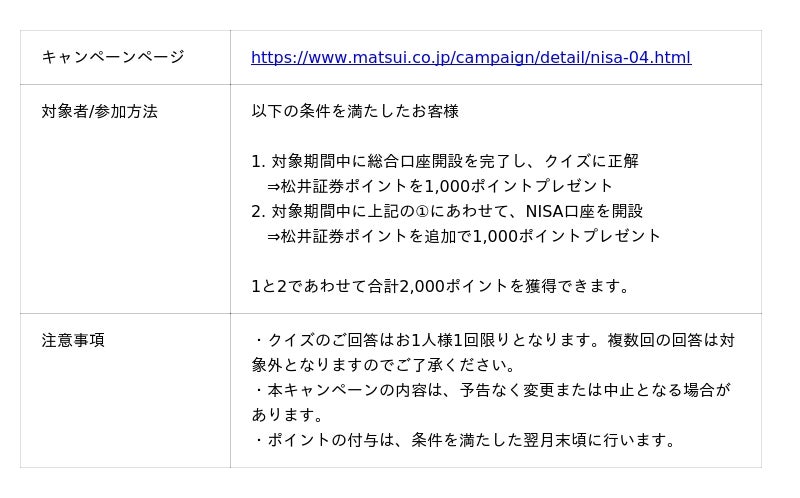新規で松井証券総合口座及びNISA口座を開設したお客様で、クイズに正解したお客様全員に松井証券ポイントを2,000ポイントプレゼントします。