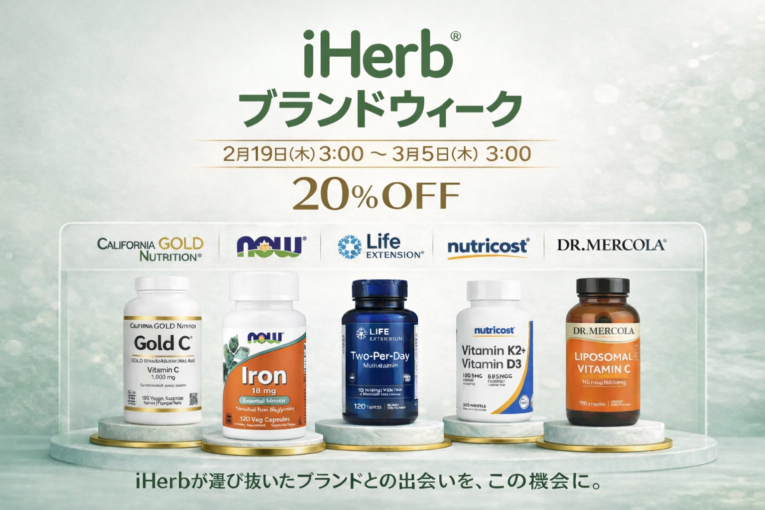 California Gold Nutrition、NOW Foods、Life Extensionをはじめ、品質・成分・思想にこだわり抜いたiHerb厳選ブランドを、通常よりもお得な価格でお試しいただけます。愛用中のサプリメントの買い足しはもちろん、これまで気になっていたクリーンビューティーのスキンケアやボディケア、プロテイン、ハーブティーなど、ブランドの世界観や思いに触れながら新たな一品と出会える機会です。iHerbは、信頼できるブランドを知り、選ぶことは、自分を大切にすることだと考えています。
