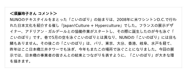「続・日本橋こいのぼりなう!」の見どころや制作の裏側を、テキスタイルデザイナーの須藤玲子さんがご説明します。