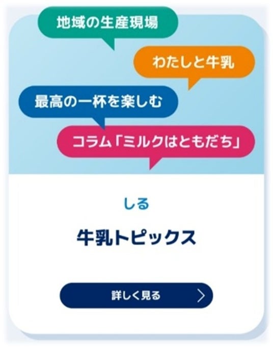 3. 牛乳トピックス (Milk Topics) 牛乳トピックスは、牛乳に関するさまざまな情報を記事コンテンツとして紹介するコーナーです。“地域の生産現場から”“わたしと牛乳”“最高の一杯を楽しむ”“コラム「ミルクはともだち」”の四つのカテゴリーで構成し、牛乳の生産に関わる方々の視点、牛乳に関する話題、牛乳の楽しみ方など多様な切り口で牛乳の魅力を伝えます。