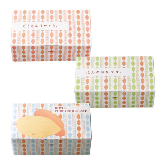 パッケージにデザインされたカカオに自由にメッセージを書き込めるボックスに人気のピュアチョコレート[ホワイト]、[キャラメルミルク]、[フルーティミルク]、[マイルドビター]の4種類を詰め合わせました。ちょっとした気持ちを伝えるのにぴったりなひと箱です。「どうもありがとう。」・「ほんのお礼です。」のメッセージが入ったボックスもご用意しております。