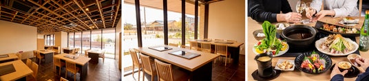 「あわら温泉湯のまち広場」に面した大きな窓と天井の格子が特徴のレストラン(中央)、コース料理のイメージ(右)