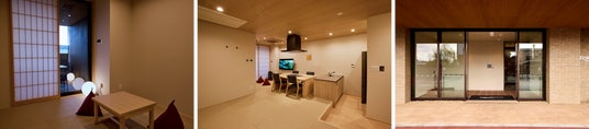 畳の上で愛犬と過ごせる室内(左/中央)、ペット用足洗場のあるエントランス(右)