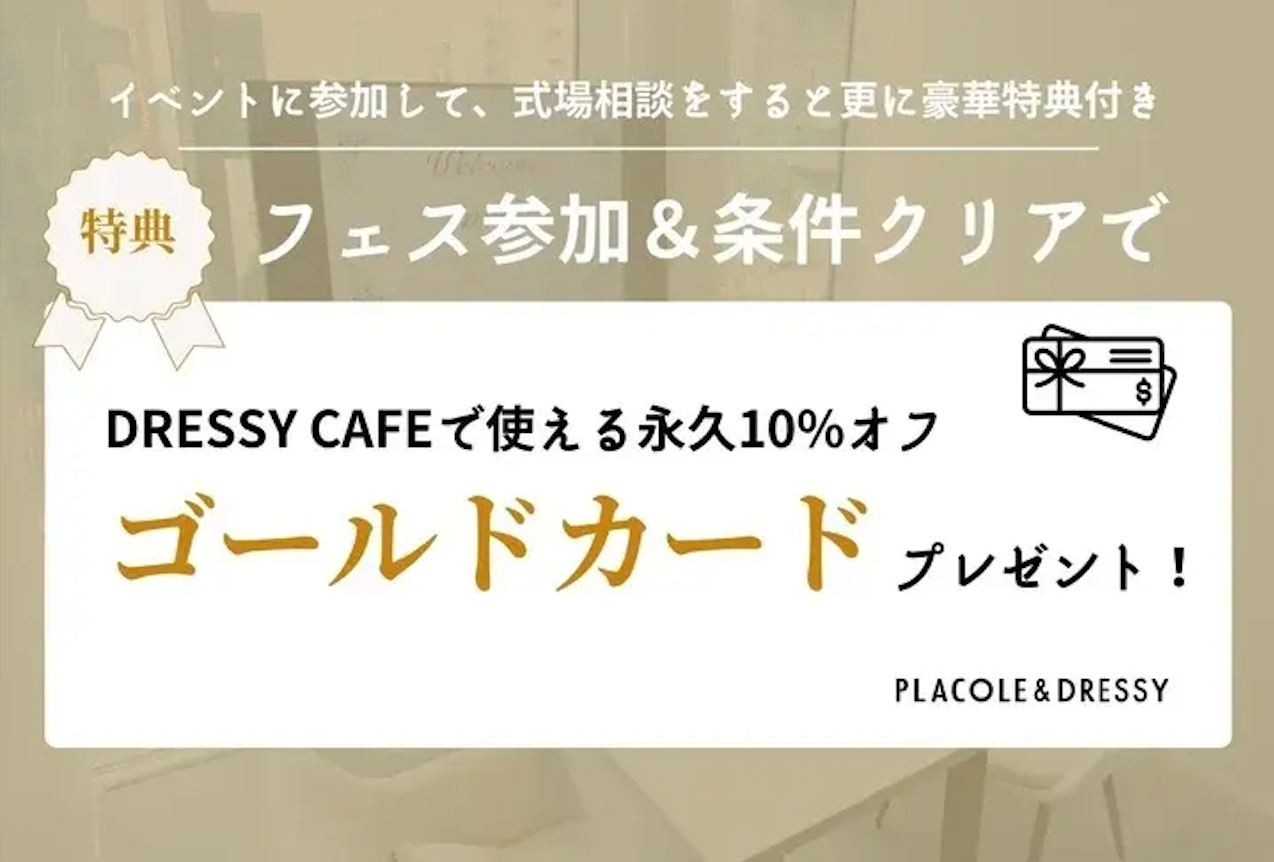 全国のDRESSY CAFEで永久に10%OFFでご利用いただけるゴールド会員カードをプレゼント。お得な特典が満載のこの機会にぜひイベントに参加してみてください。
