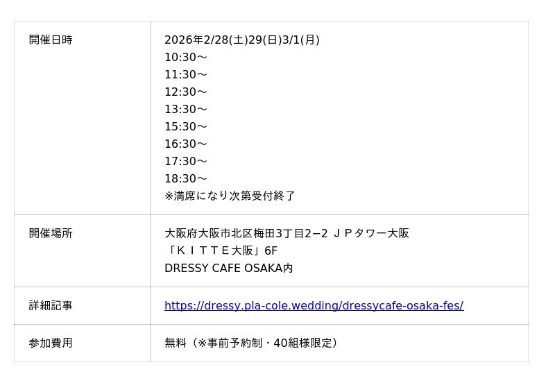 大阪駅直結の話題のカフェ"DRESSY CAFE"で、おふたりの結婚式準備をサポートする特別なフェスが2/28(土)~3/2(月)限定で開催決定。先着10組さま限定で準備を始めた今しか撮影できないスタートドレスフォトをプレゼント。普段のフェアでは体験ができない、充実したコンテンツを体験が叶います。