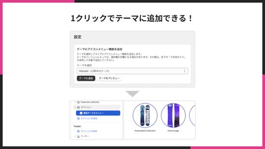 管理画面から設定するだけで簡単に導入でき、ストア全体のナビゲーションを直感的に改善できます。