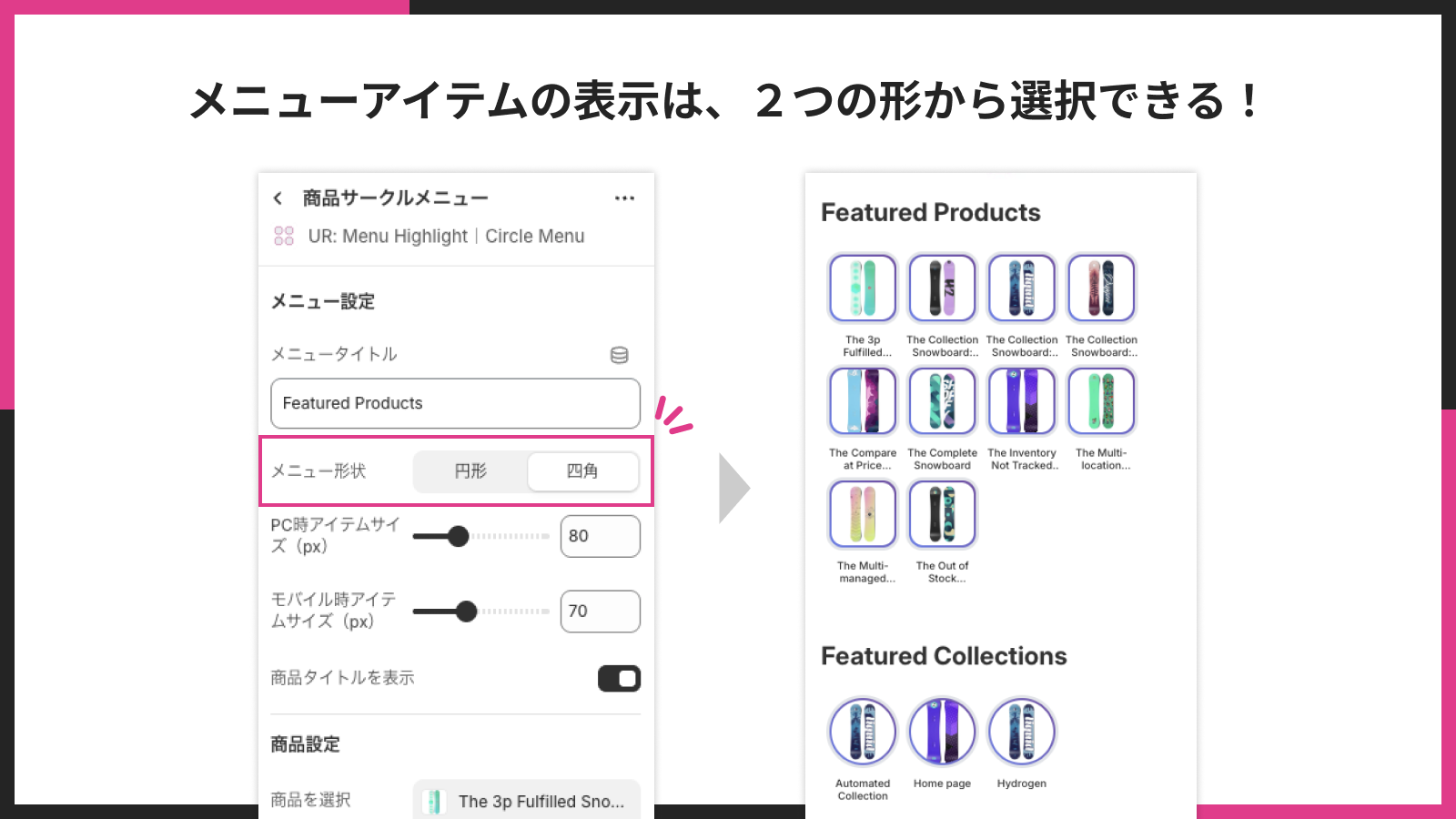 商品ページやコレクションページごとに専用のサークルメニューを作成できます。